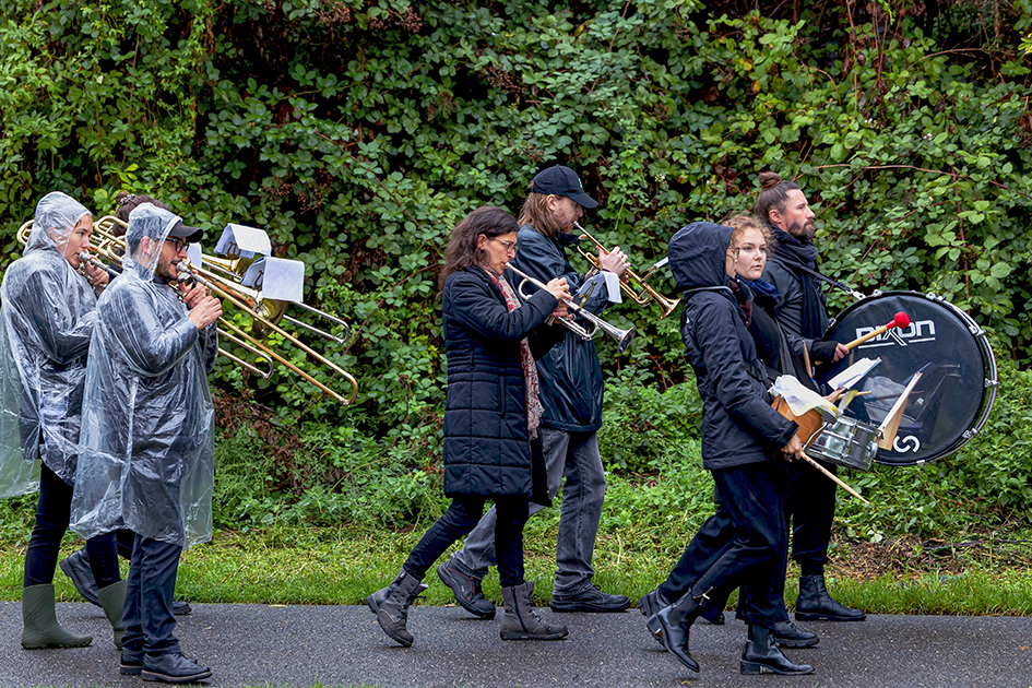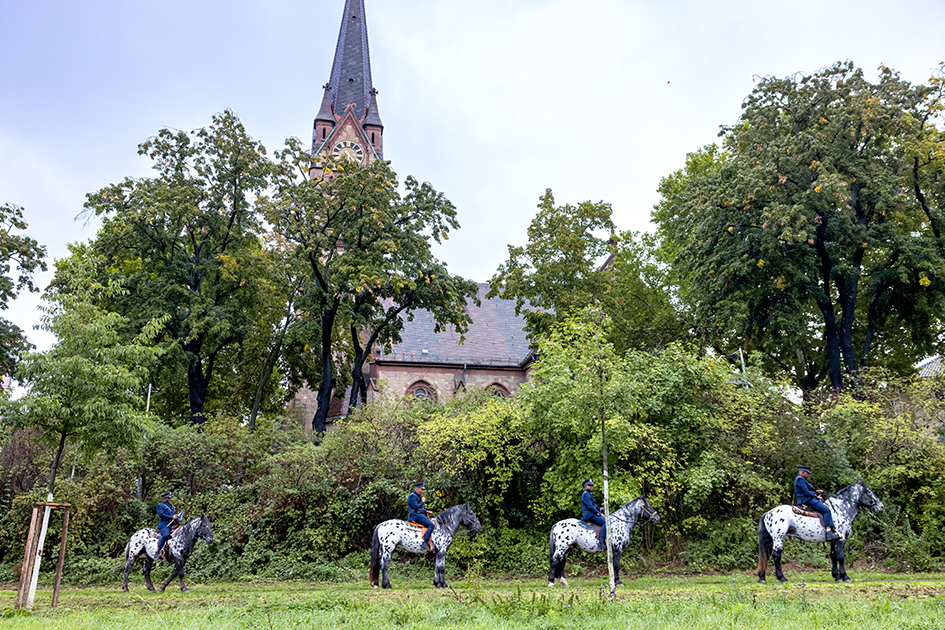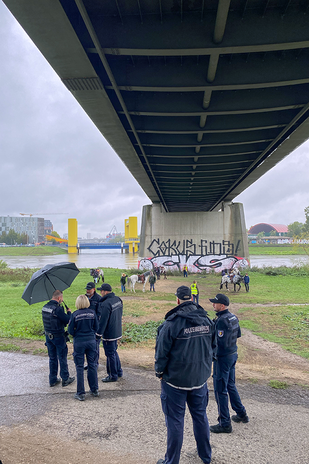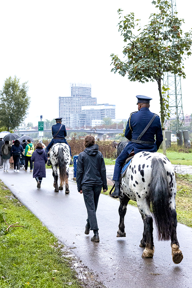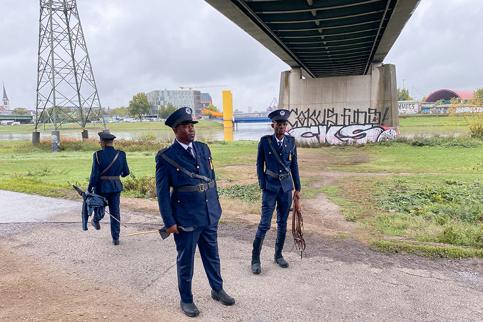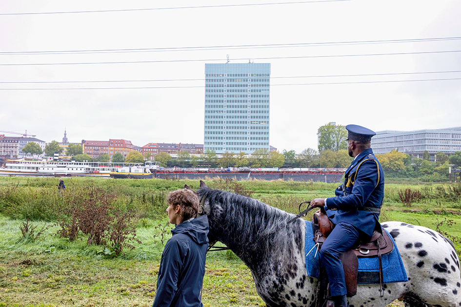 Der Marsch, der ursprünglich durch die Innenstadt führen sollte, musste mangels Genehmigung mit strengen Sicherheitsauflagen an den Neckarauen durchgeführt werden. Die Uniformen der Reiter, erinnerten an die Bekleidung der deutschen Schutztruppe, die in der ehemaligen Kolonie Deutsch-Südwestafrika einen Völkermord an den Ovaherero und Nama begangen hatten. In einer Intervention rief der Dichter Prince Kamaazengi Marenga, dessen Vorfahren vor den deutschen Soldaten durch die Omaheke-Wüste nach Botswana fliehen mussten, Bilder von Flucht und Vertreibung wach, während die Musiker*innen aus Mannheim in einer Komposition von Friedrich Stockmeier die Möglichkeiten des Gedenkens mit einer Musik befragten, die als Marsch zum Gleichschritt auffordert und an militärischen Gebrauch erinnert.