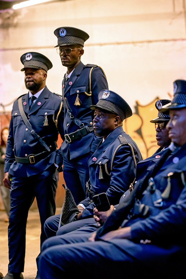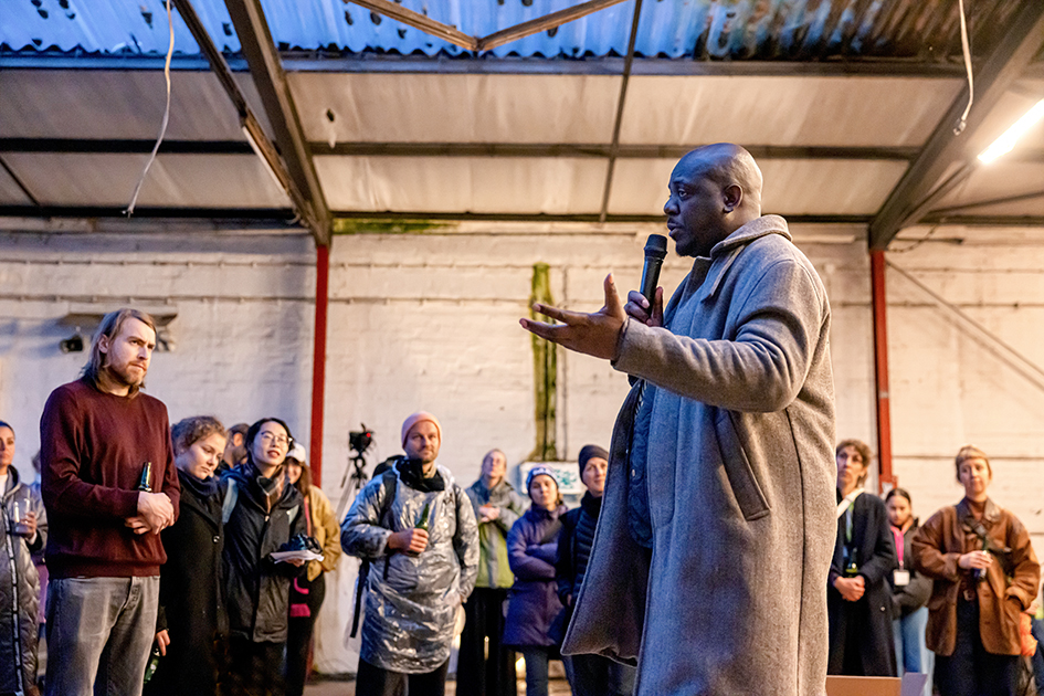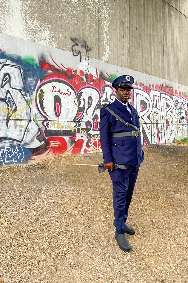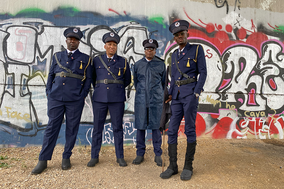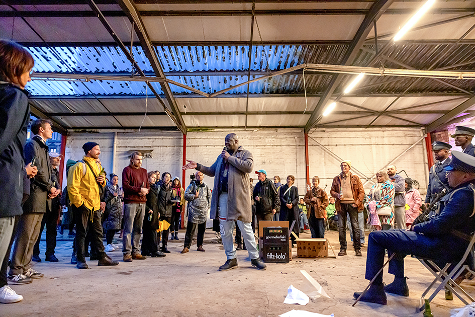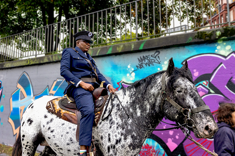 Der Marsch, der ursprünglich durch die Innenstadt führen sollte, musste mangels Genehmigung mit strengen Sicherheitsauflagen an den Neckarauen durchgeführt werden. Die Uniformen der Reiter, erinnerten an die Bekleidung der deutschen Schutztruppe, die in der ehemaligen Kolonie Deutsch-Südwestafrika einen Völkermord an den Ovaherero und Nama begangen hatten. In einer Intervention rief der Dichter Prince Kamaazengi Marenga, dessen Vorfahren vor den deutschen Soldaten durch die Omaheke-Wüste nach Botswana fliehen mussten, Bilder von Flucht und Vertreibung wach, während die Musiker*innen aus Mannheim in einer Komposition von Friedrich Stockmeier die Möglichkeiten des Gedenkens mit einer Musik befragten, die als Marsch zum Gleichschritt auffordert und an militärischen Gebrauch erinnert.