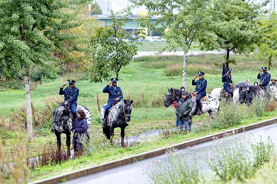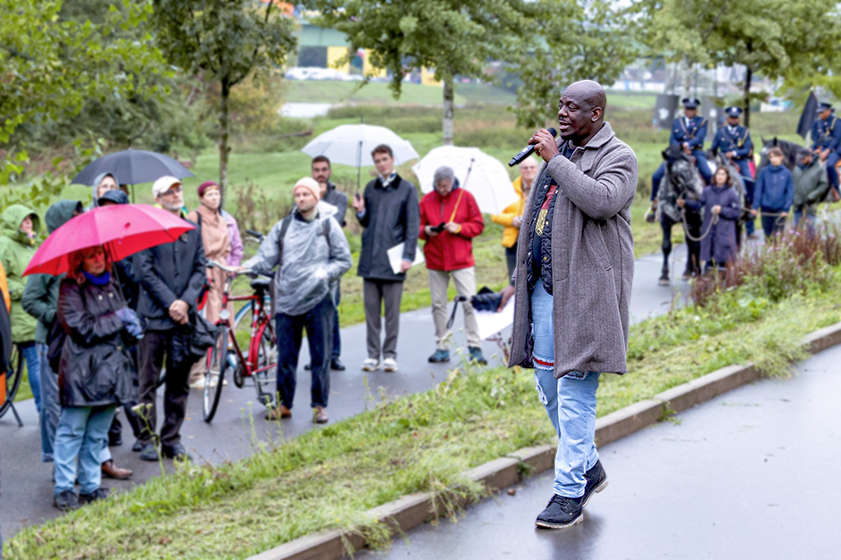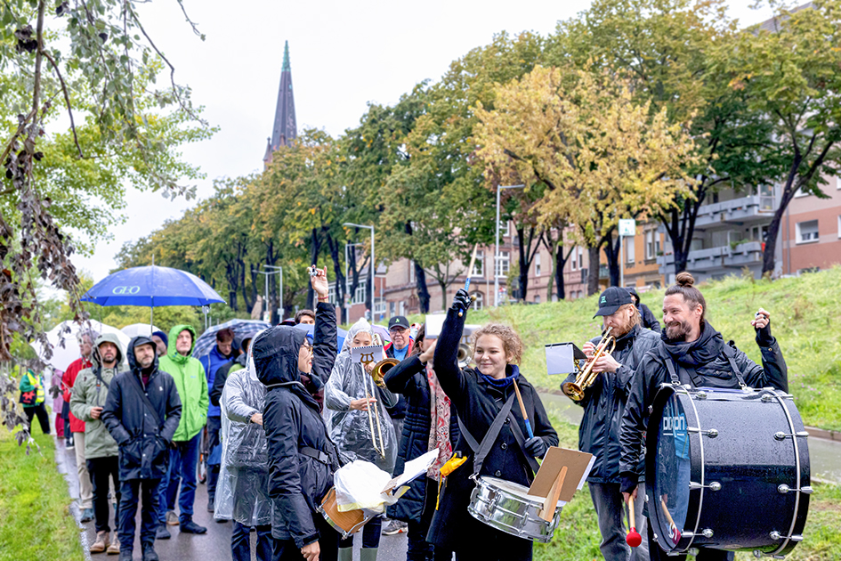 Der Marsch, der ursprünglich durch die Innenstadt führen sollte, musste mangels Genehmigung mit strengen Sicherheitsauflagen an den Neckarauen durchgeführt werden. Die Uniformen der Reiter, erinnerten an die Bekleidung der deutschen Schutztruppe, die in der ehemaligen Kolonie Deutsch-Südwestafrika einen Völkermord an den Ovaherero und Nama begangen hatten. In einer Intervention rief der Dichter Prince Kamaazengi Marenga, dessen Vorfahren vor den deutschen Soldaten durch die Omaheke-Wüste nach Botswana fliehen mussten, Bilder von Flucht und Vertreibung wach, während die Musiker*innen aus Mannheim in einer Komposition von Friedrich Stockmeier die Möglichkeiten des Gedenkens mit einer Musik befragten, die als Marsch zum Gleichschritt auffordert und an militärischen Gebrauch erinnert.